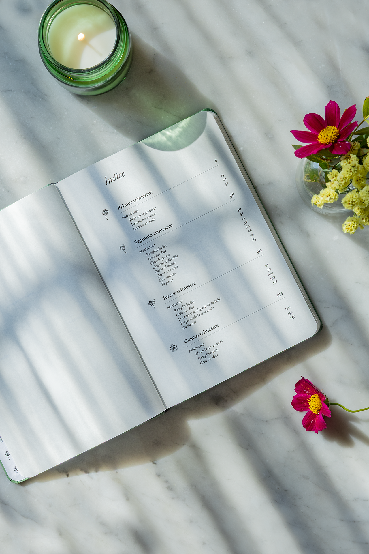 - 16 prácticas para profundizar en distintos aspectos de tu vida como tu historia familiar, tu rutina diaria o tu relación de pareja; prácticas de visualización y preparación al parto y a la maternidad, y una práctica para planificar el inicio del posparto, para que la transición sea más suave y ligera.