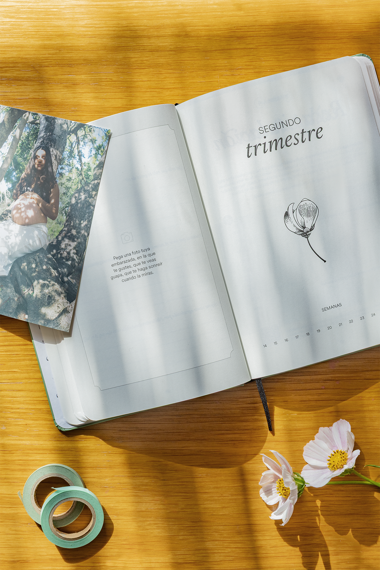 - Un apartado al inicio de cada trimestre para pegar una foto tuya embarazada, y así ver la evolución de tu barriga y poder revivir esos momentos cada vez que lo vuelvas a leer.